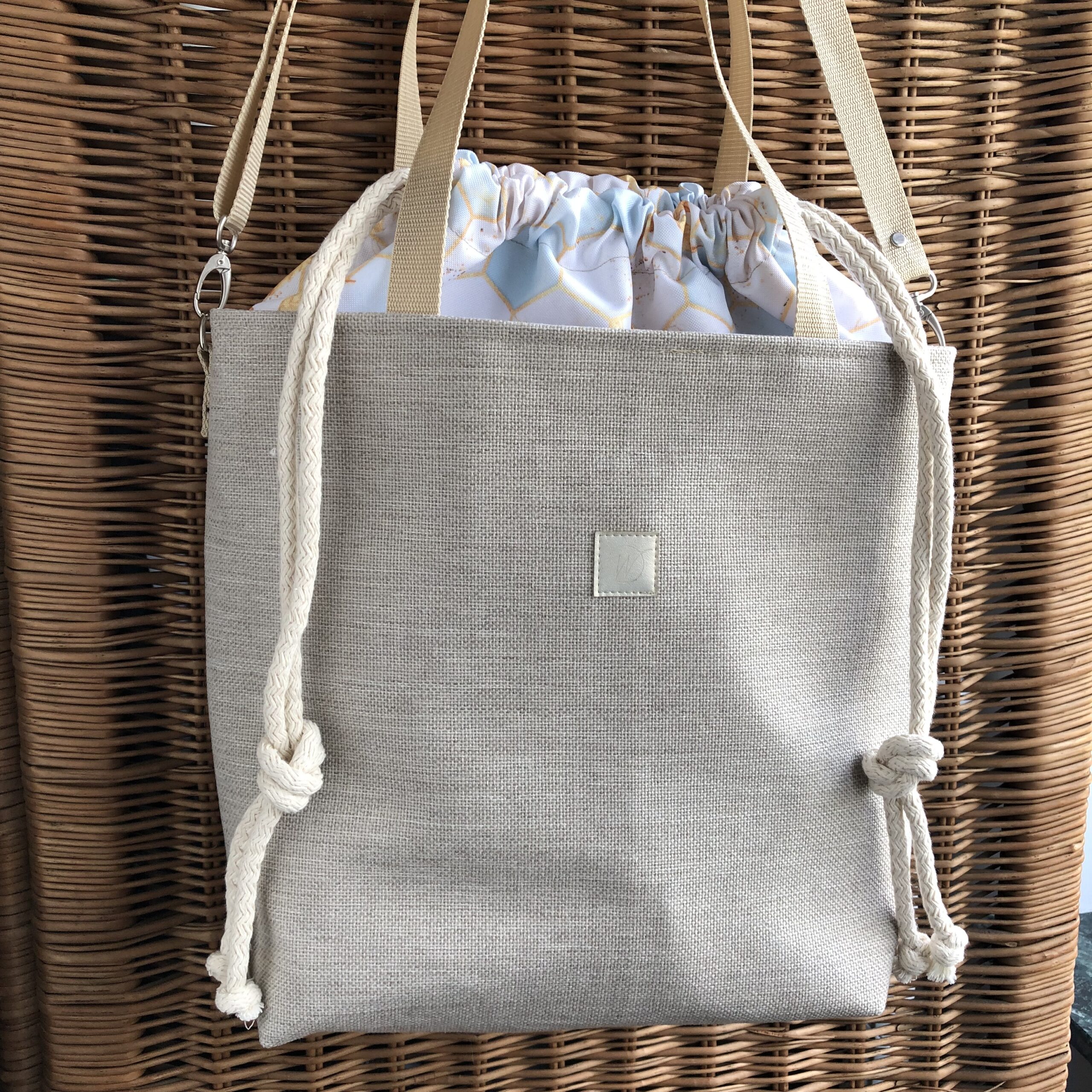 Materiały: zewnętrzny: tkanina tapicerska, komin: poliester wodoodporny, podszewka: tkanina bawełniana.