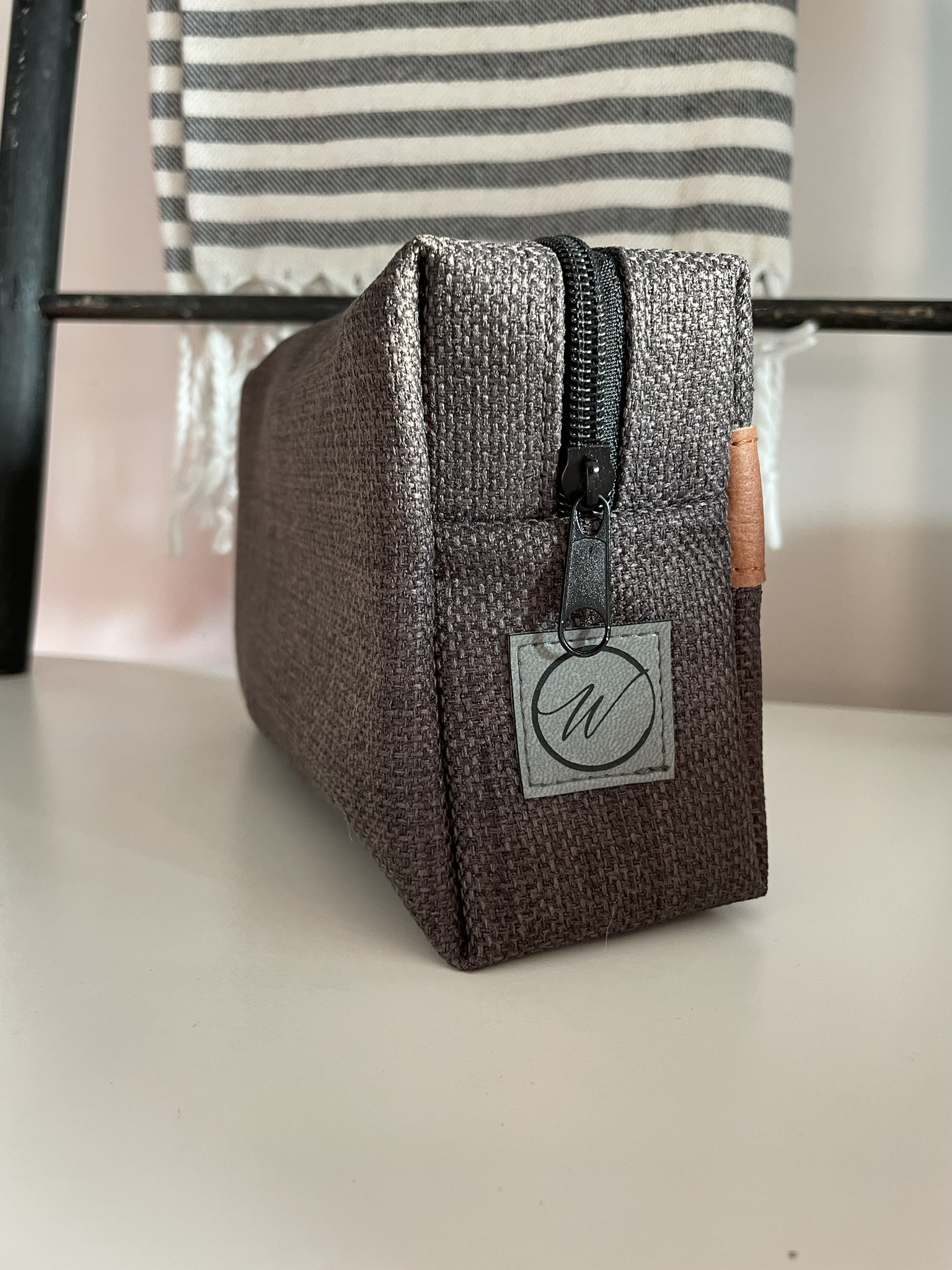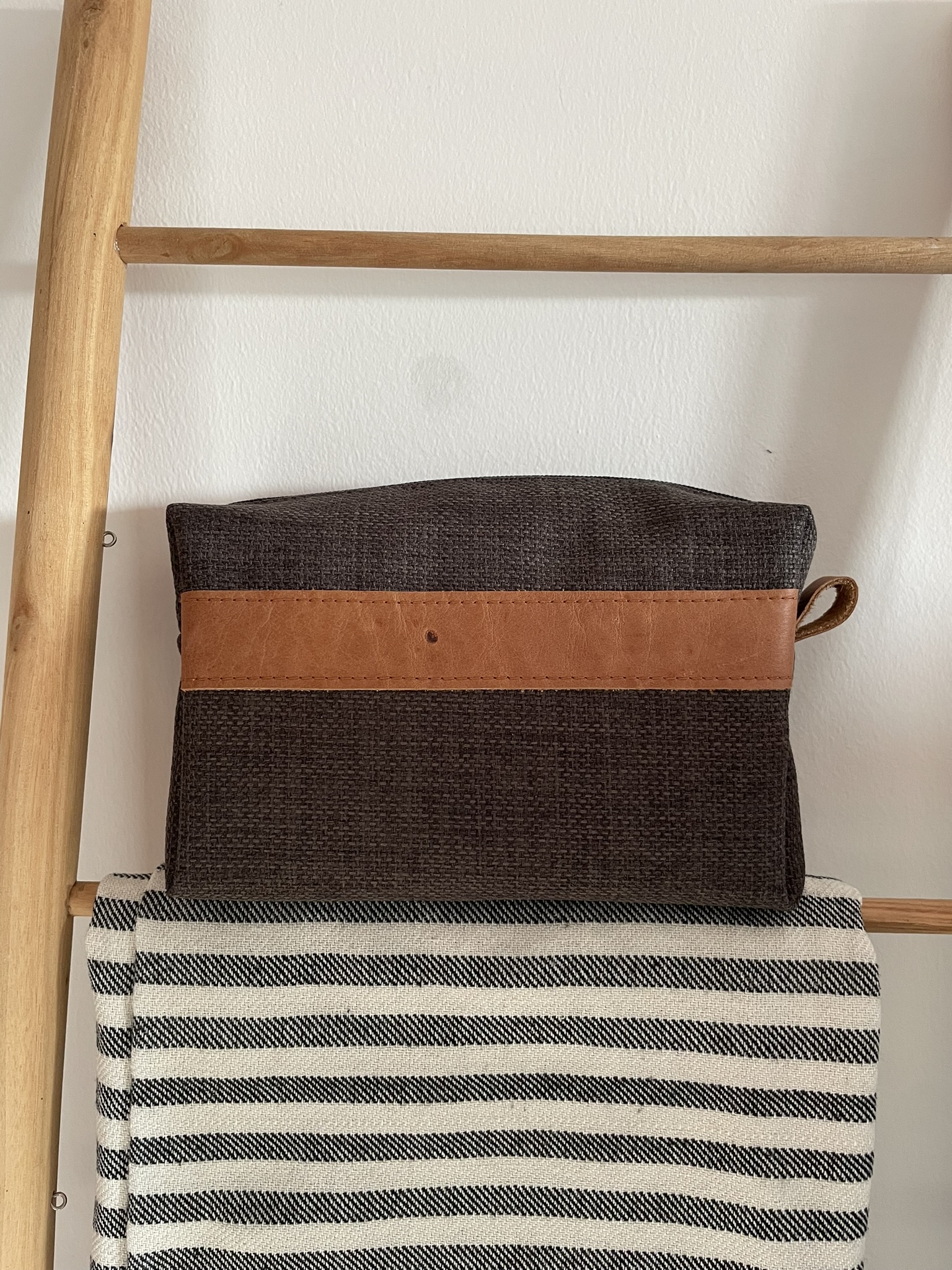 Minimalistyczna, stylowa i praktyczna – kosmetyczka „Kostka” to unikalny dodatek, który świetnie sprawdzi się w codziennym użytkowaniu i podróży. Każdy egzemplarz jest ręcznie szyty z trwałych tkanin tapicerskich, a ozdobny pasek z naturalnej karmelowej skóry dodaje jej wyjątkowego charakteru.